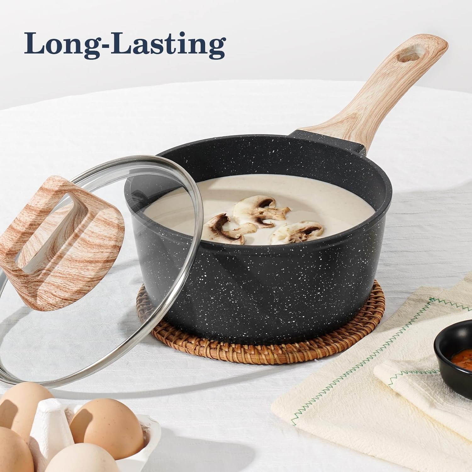 • Juego de ollas todo en uno - Desde freír y hervir hasta hervir a fuego lento y saltear, este juego de ollas antiadherentes incluye sartén, sartén para saltear, cacerola, lecheras y protectores de sartén. Simplifique su cocina con este completo juego de ollas y sartenes, cuidadosamente seleccionado para cubrir todas sus necesidades culinarias diarias.